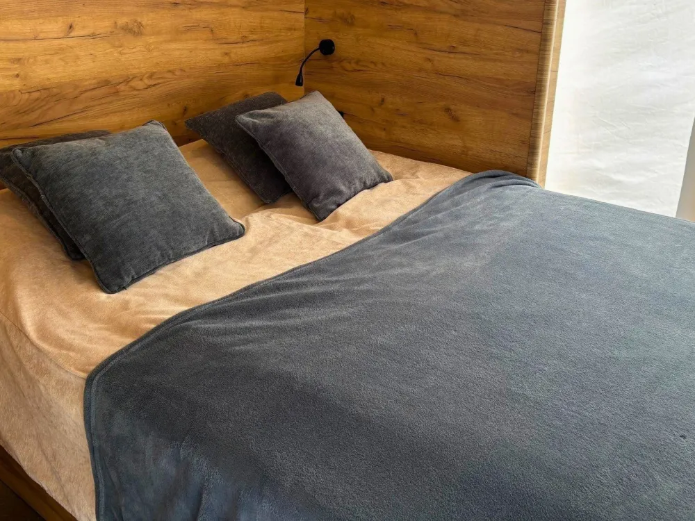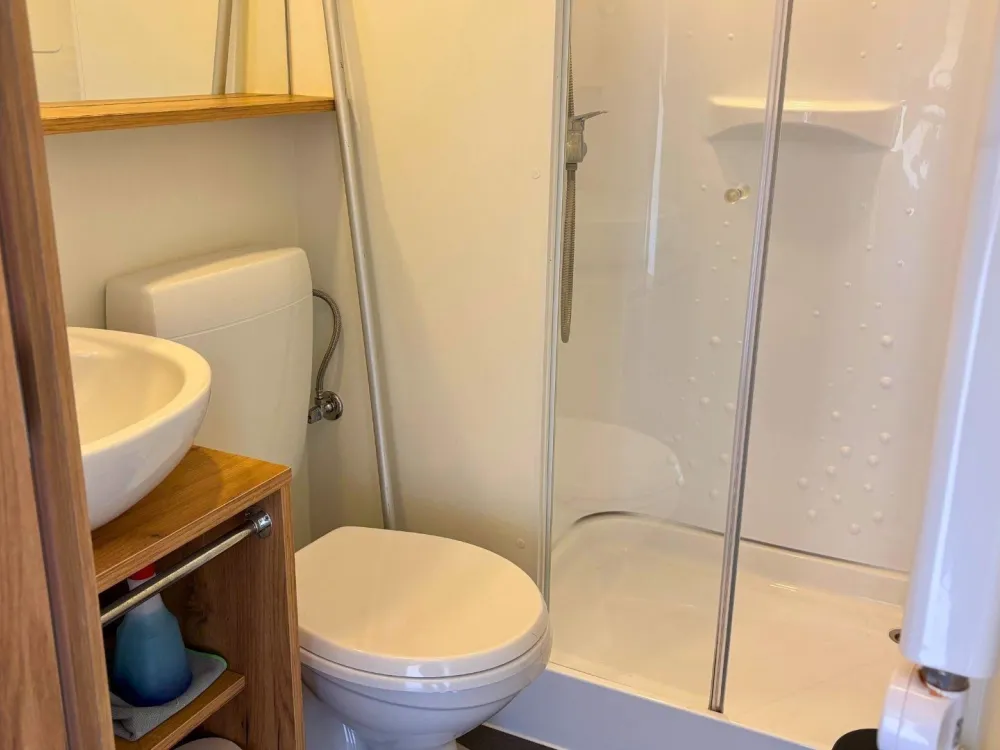 Zwei Schlafnischen, eines mit einem Doppelbett (140 cm), der andere hat ein Hochbett (70cm). Eine kleine Pantry mit Kühlschrank mit Eisfach, Herd, Mikrowelle und Kaffemaskine. Wohnzimmer mit offenem Grundriss, mit Essplatz, mit einem kleinen Sofa und Fernseher. Badezimmer mit Dusche/WC. 6 cm2 große Terrasse mit zwei Sonnenstühlen. AC und WLAN gibt es. Sie nehmen selbst Handtücher und Bettlaken mit. Haustiere und Rauchen ist verboten.