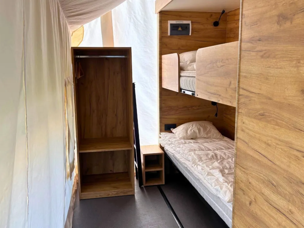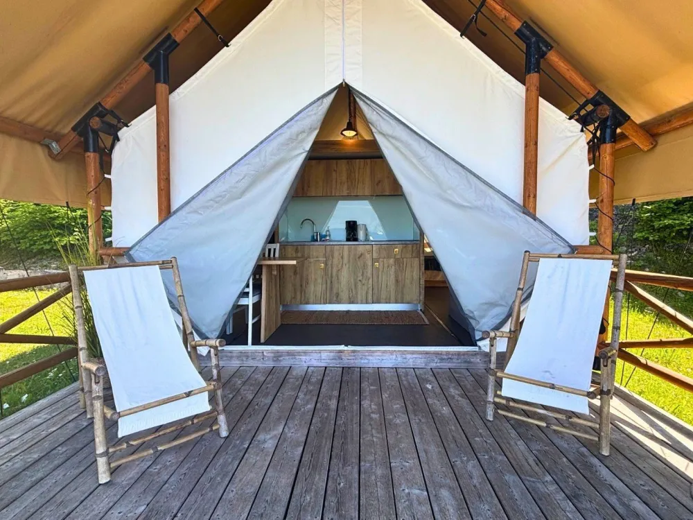 Safarizelt von ca. 30 cm2 mit 4 Betten, es liegt in naturschönen Umgebungen am Meer, in der Nähe von Kneippbyns Sommer und Wasserland.