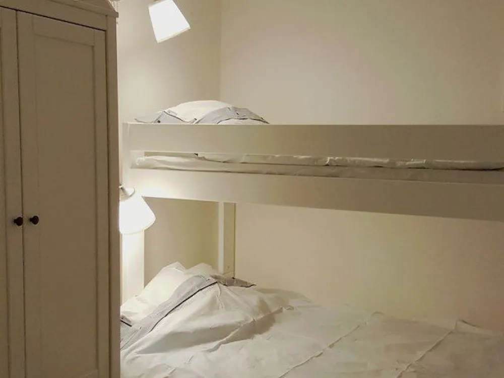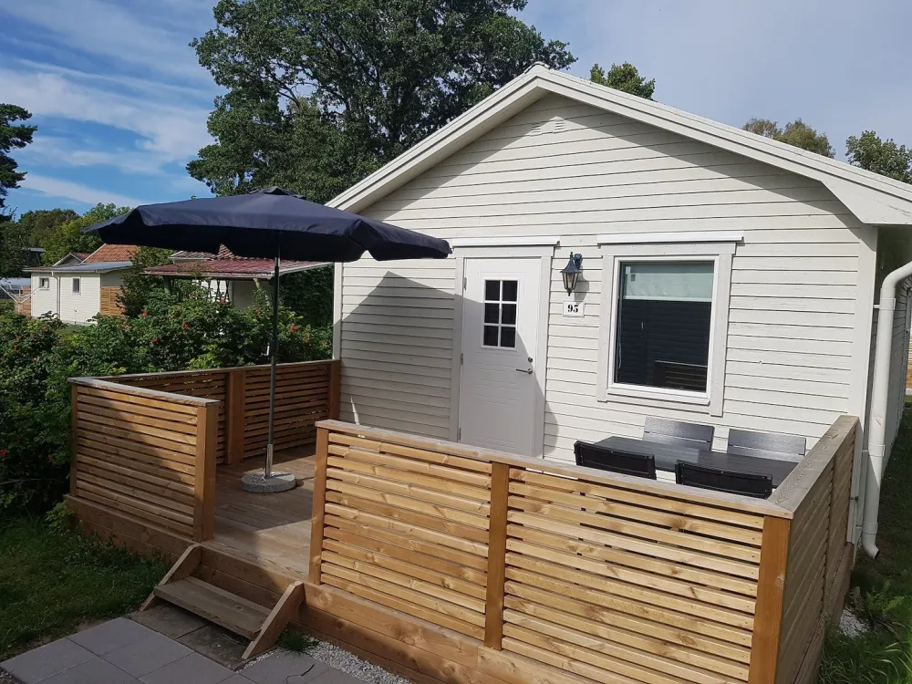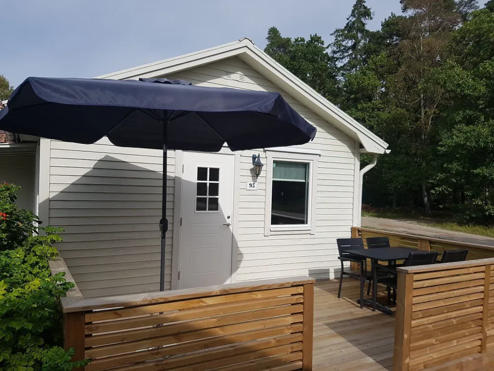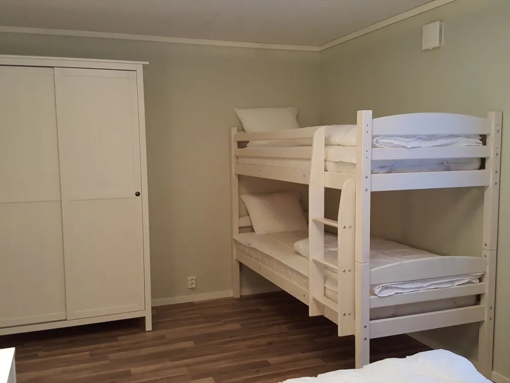 Semi-detached house of 48sqm with two bedrooms and a bathroom with shower/WC. The master bedroom has a double bed (2 single beds) and a bunk bed. The second bedroom has a family bunk bed where the lower bunk is 120cm. Living room and kitchen area with stove, oven, dishwasher, microwave and fridge/freezer. The house has its own furnished terrace. The cottage is pet-free.