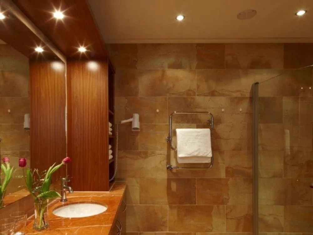 Fully tiled bathroom with shower, towel warmer, hairdryer, and ample storage
