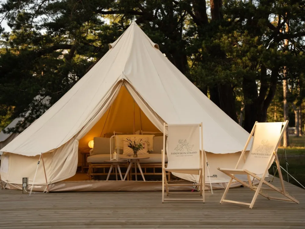 Våra glampingtält finns i år även med enklare inredning för dig som har egen tältutrustning. Ett utomhusboende som förenklar din tältvistelse. Du har tillgång till en mindre kyl, värmare, viss belysning och en trall med utomhusmöbler och solstolar. Alltid med närhet till doften av tall och hav.