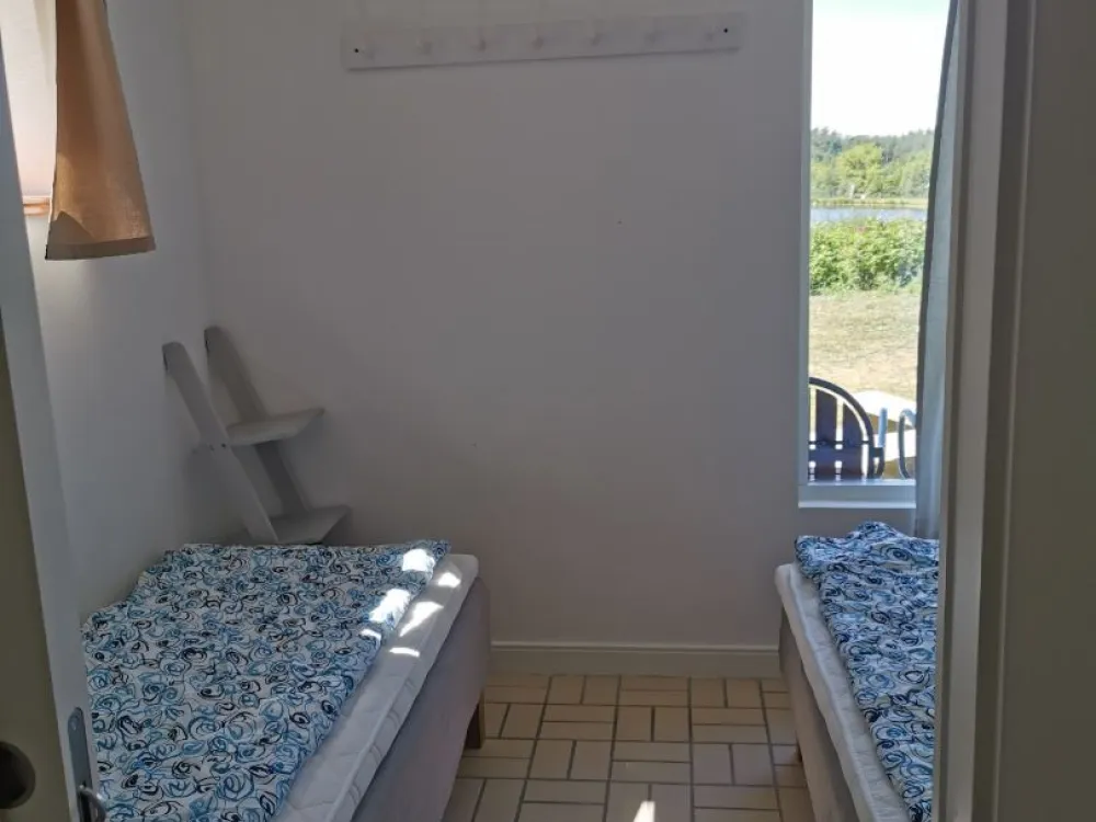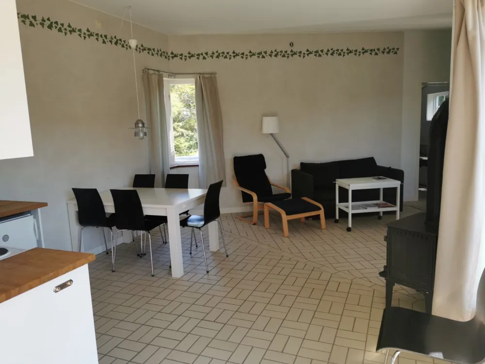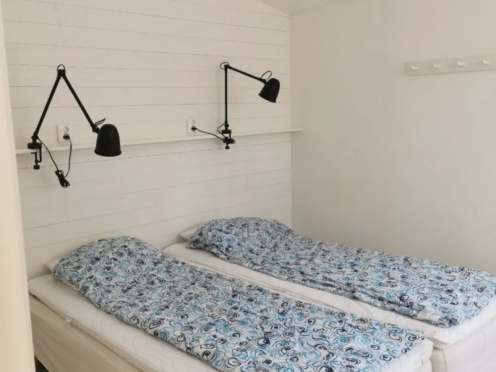 Stuga på 58 kvm med två sovrum, vardagsrum, badrum och kök. Det finns ett stort sovrum med dubbelsäng och en bäddsoffa för 2 samt ett mindre sovrum med två enkelsängar.