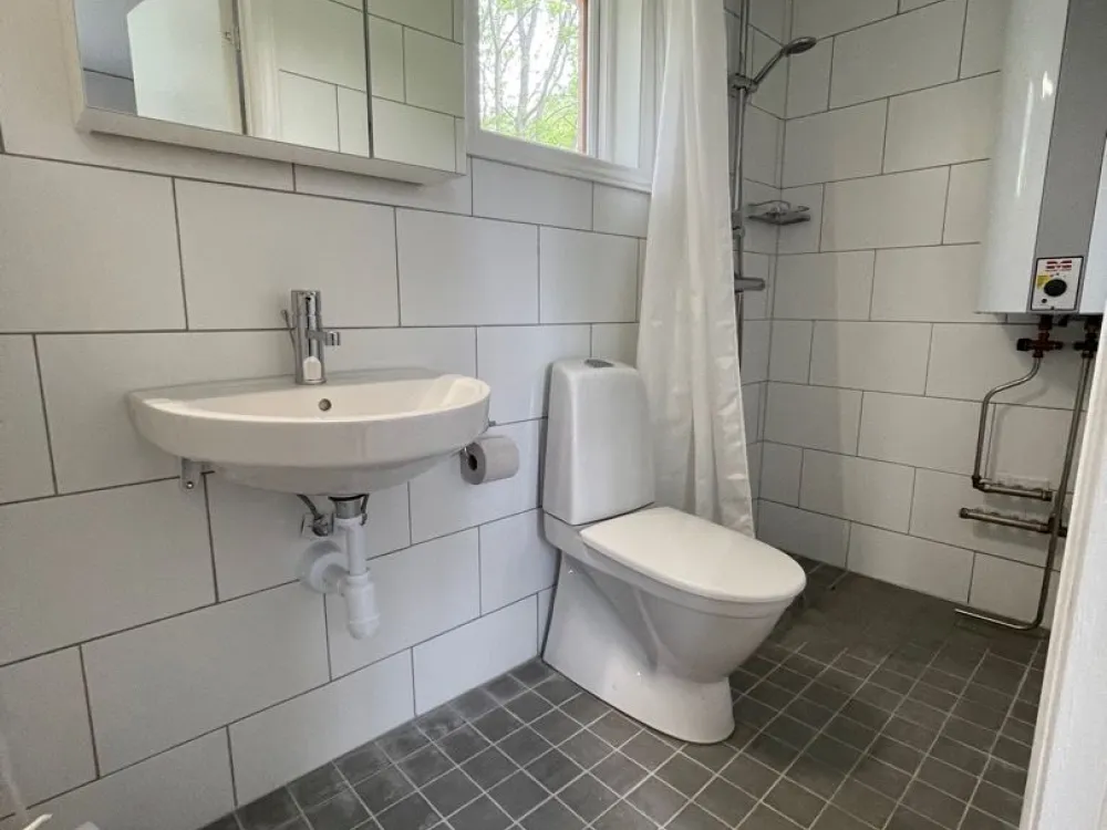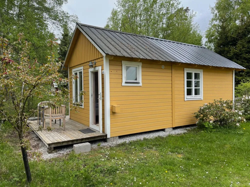 Stuga med wc, dusch, kökspentry, kyl och uteplats med grill.