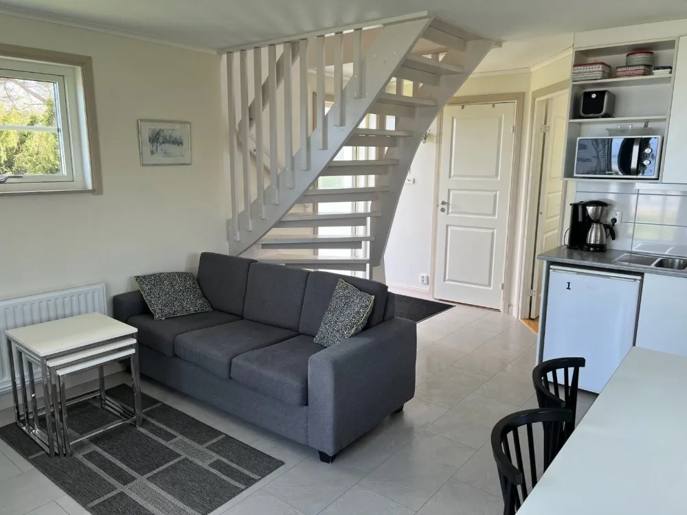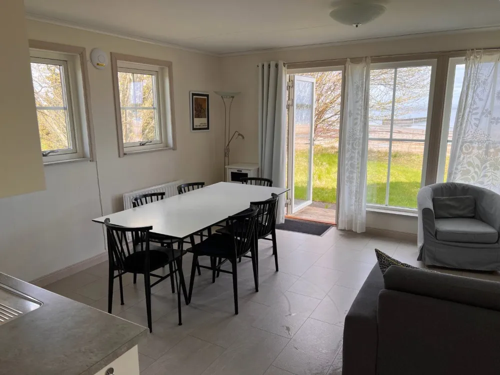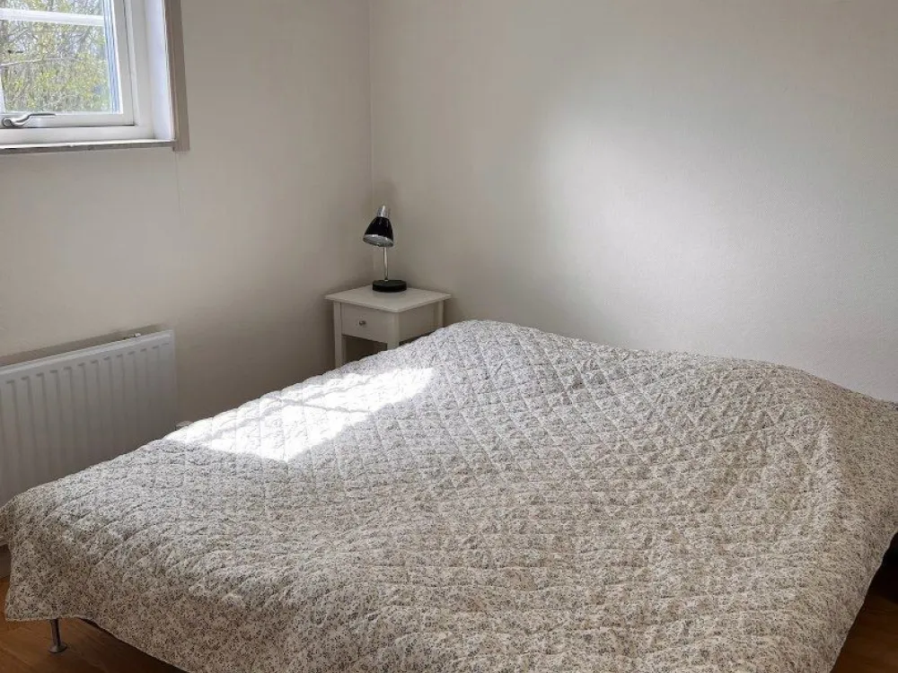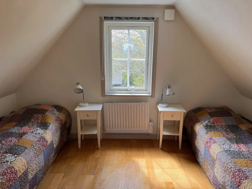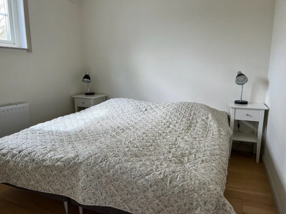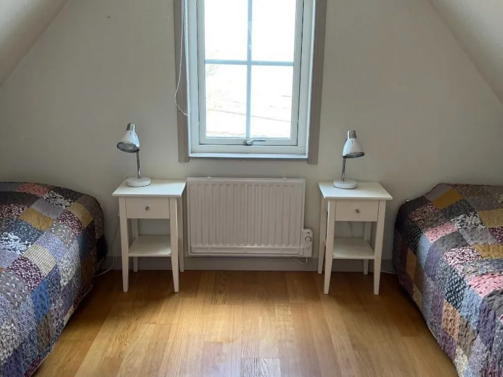 Master bedroom på nedre plan med dubbelsäng. Vardagsrum och kök i öppen planlösning med rymlig matplats och utgång till uteplats och trädgård. Kaklat badrum med dusch. På ovanvåningen finns två sovrum med två sängar i respektive rum. Egen uteplats med grillmöjligheter.